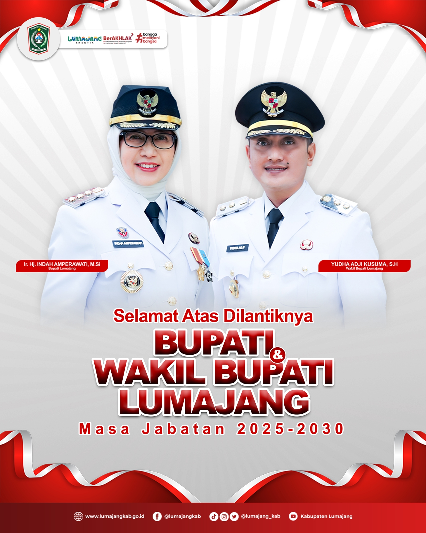 Selamat dan sukses untuk Ir. Hj. Indah Amperawati, M.Si sebagai Bupati Lumajang dan Yudha Aji Kusuma, S.H sebagai Wakil Bupati Lumajang Masa Jabatan ...